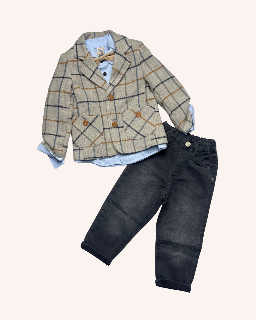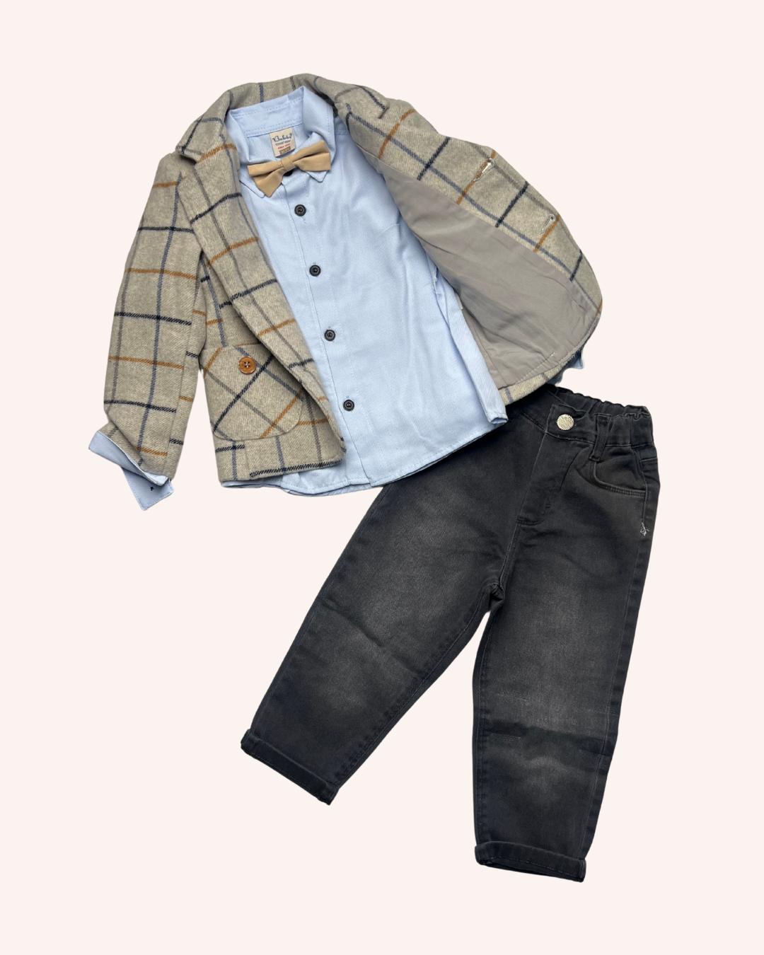 A stylish and versatile outfit for little gentlemen. This beige caro blazer paired with a crisp blue shirt and black denim pants creates the perfect balance between classy and casual — ideal for family gatherings or special occasions.