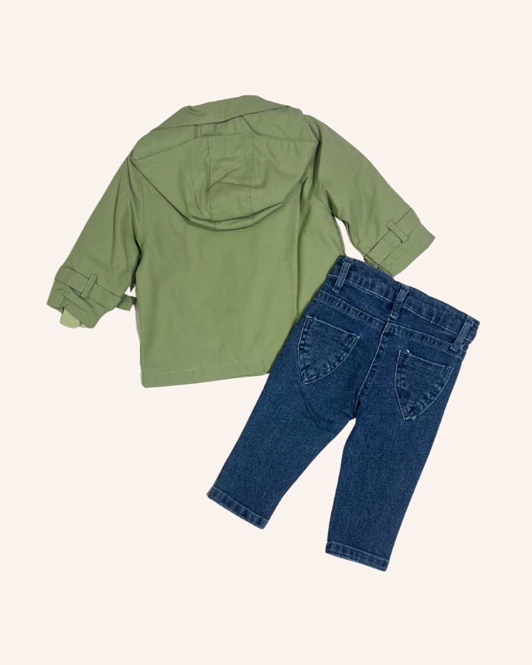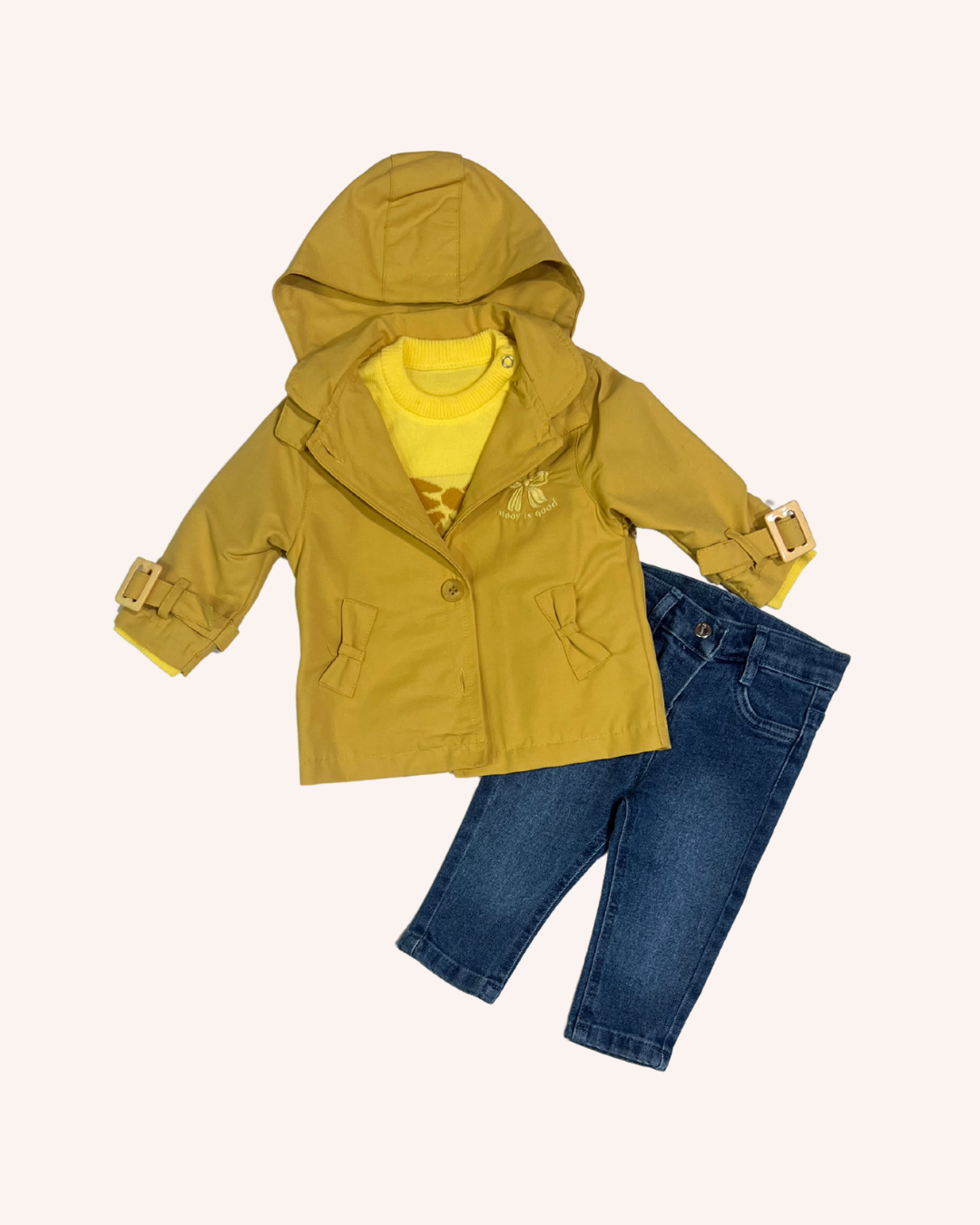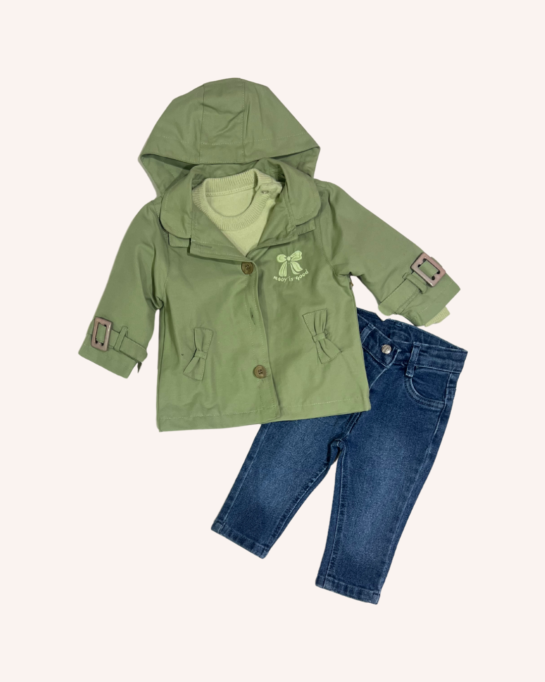 Adorable 3-pcs set featuring jacket, sweater and a jeans.