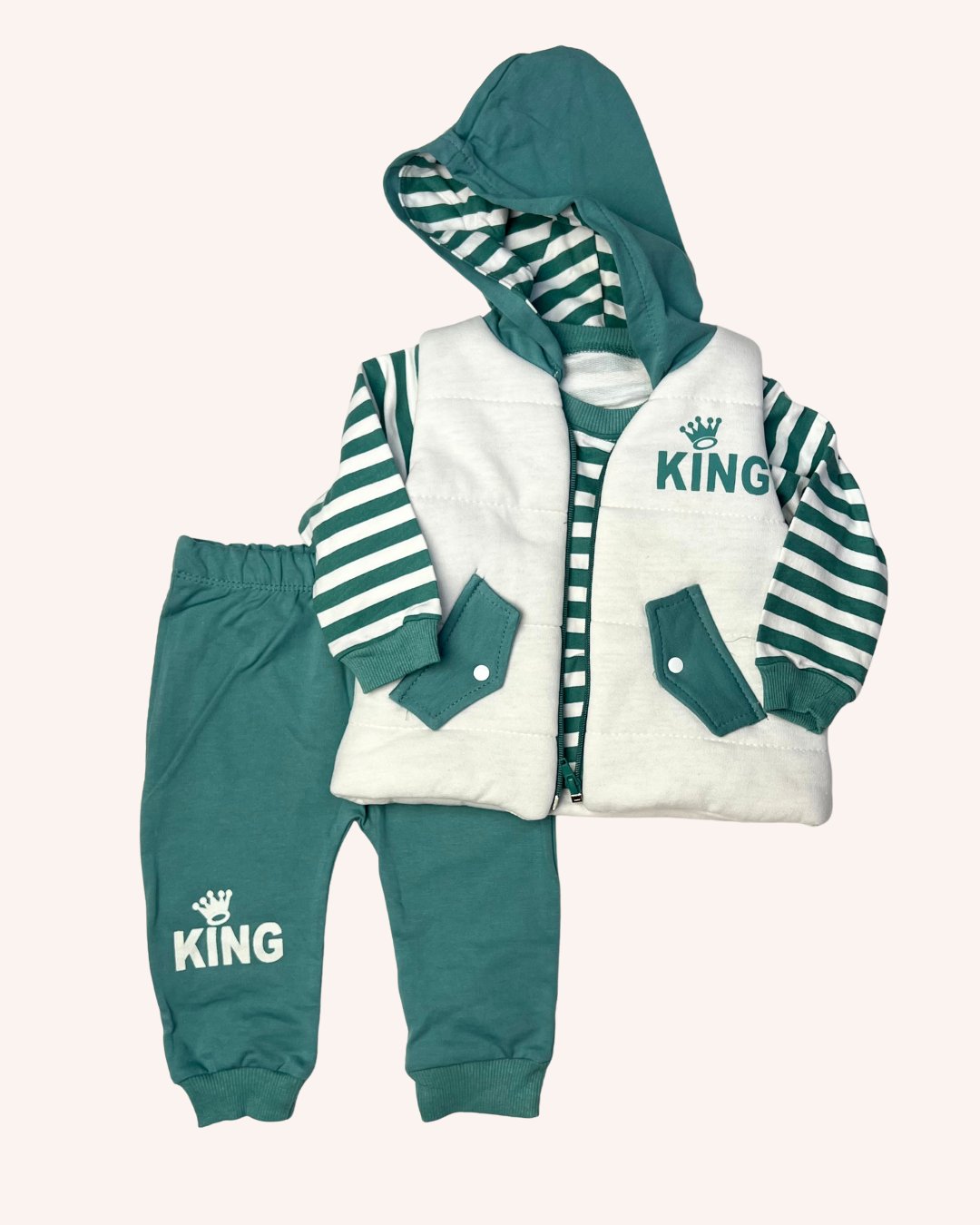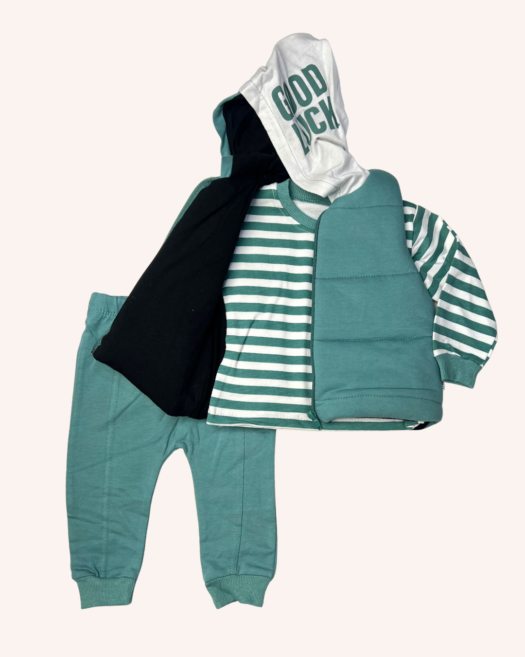 Good Luck set for you little boy featuring hooded vest, shirt and sweatpants.