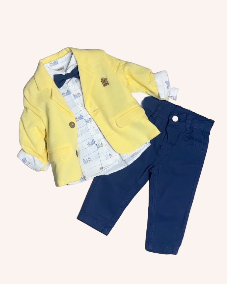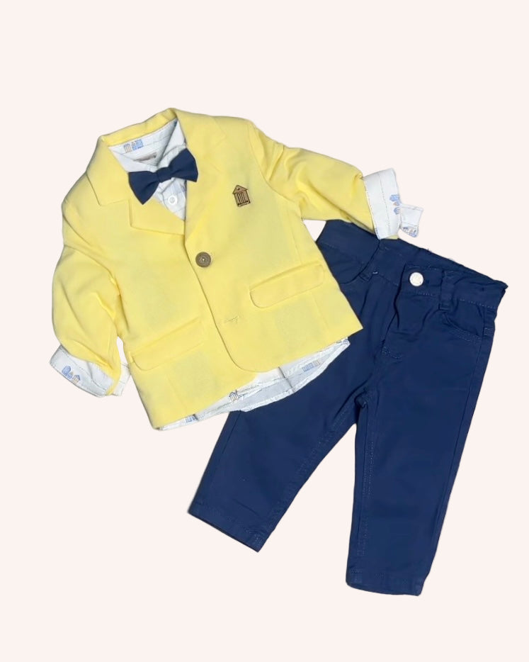 The lovely texture and feel of the material adds a unique take on our beloved baby boy 3-piece suit design. Includes the matching Jacket, Pants & Shirt. The jacket features a fold over collar and buttons.