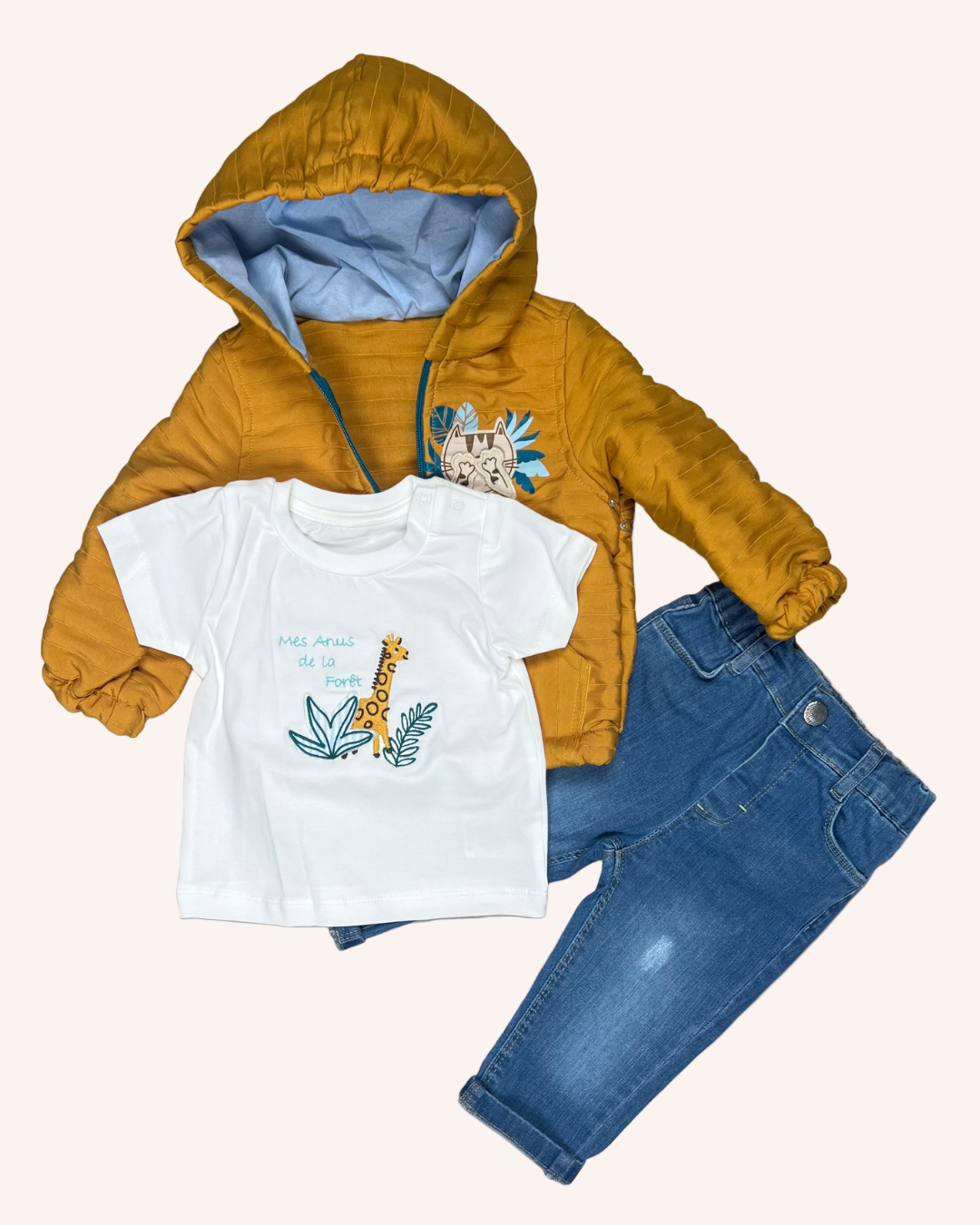 Peek a Boo in the jungle! Adorable set for you little boy featuring hooded jacket, shirt and jeans.