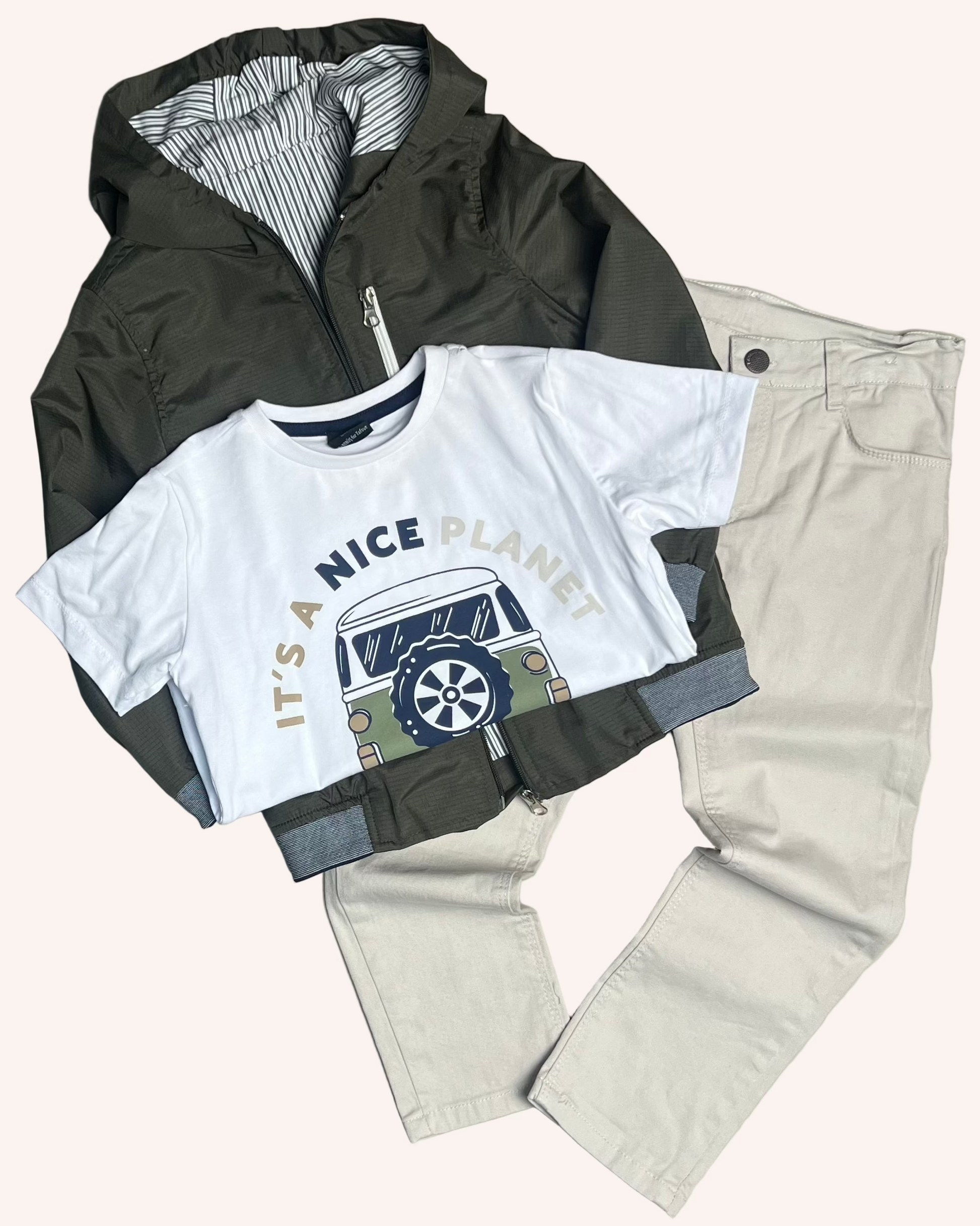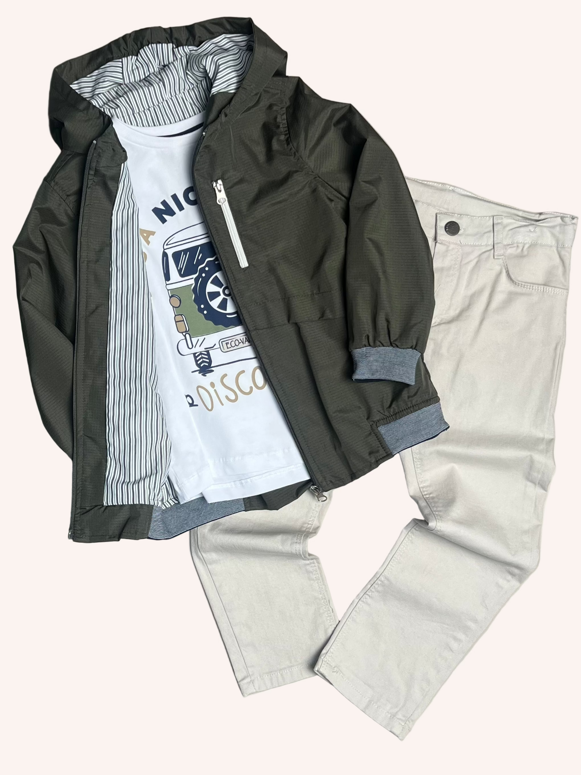 Stylish 3-Pcs set for your cool boy featuring jacket, t-shirt and pants.