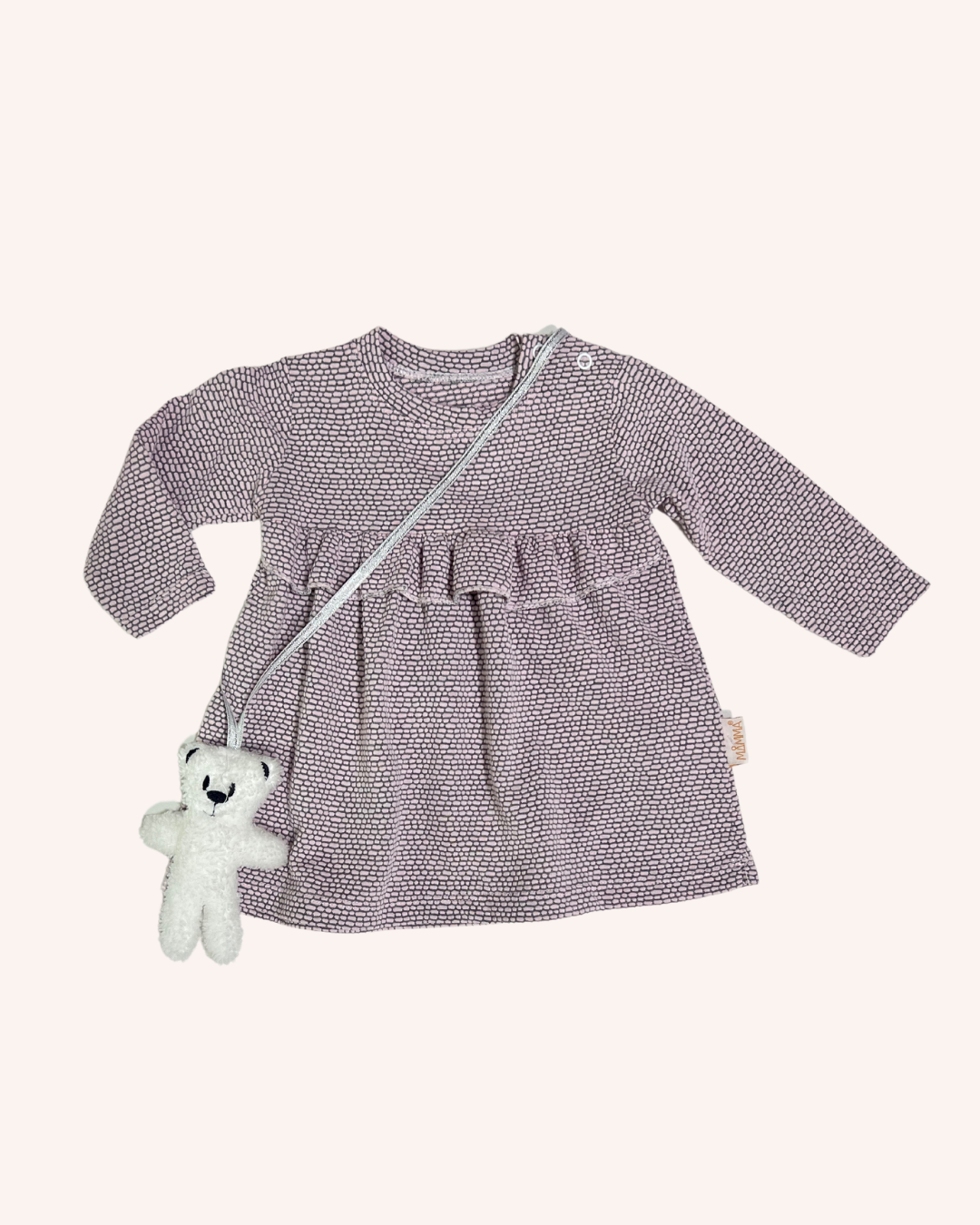Cute little teddy bear accessory, adding an adorable touch to the textured dress. Perfect for a cozy and stylish look.